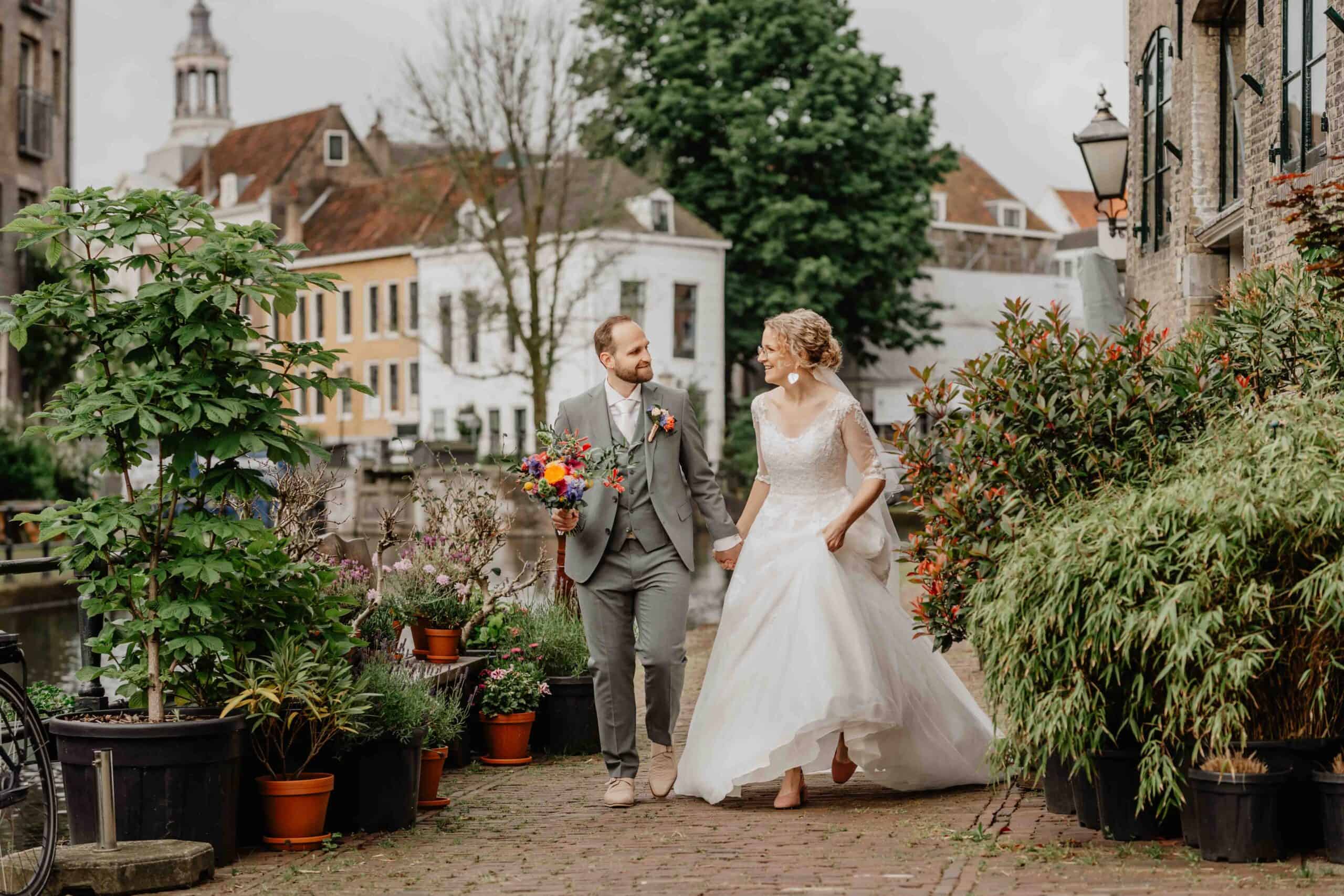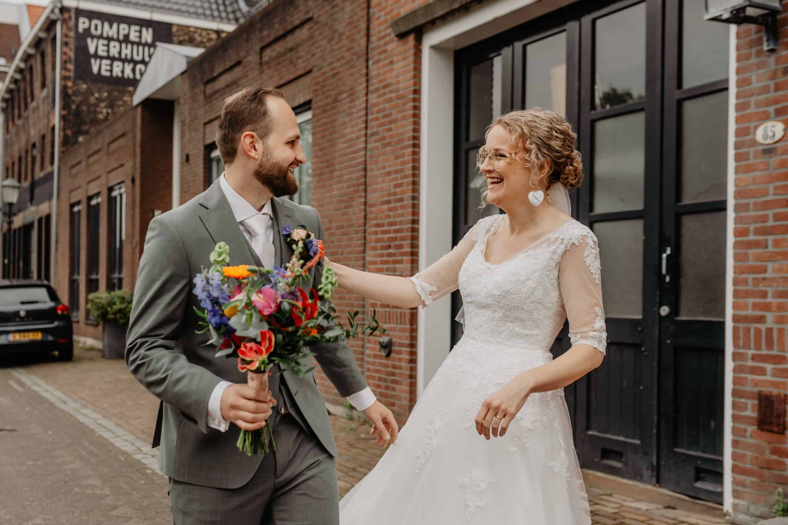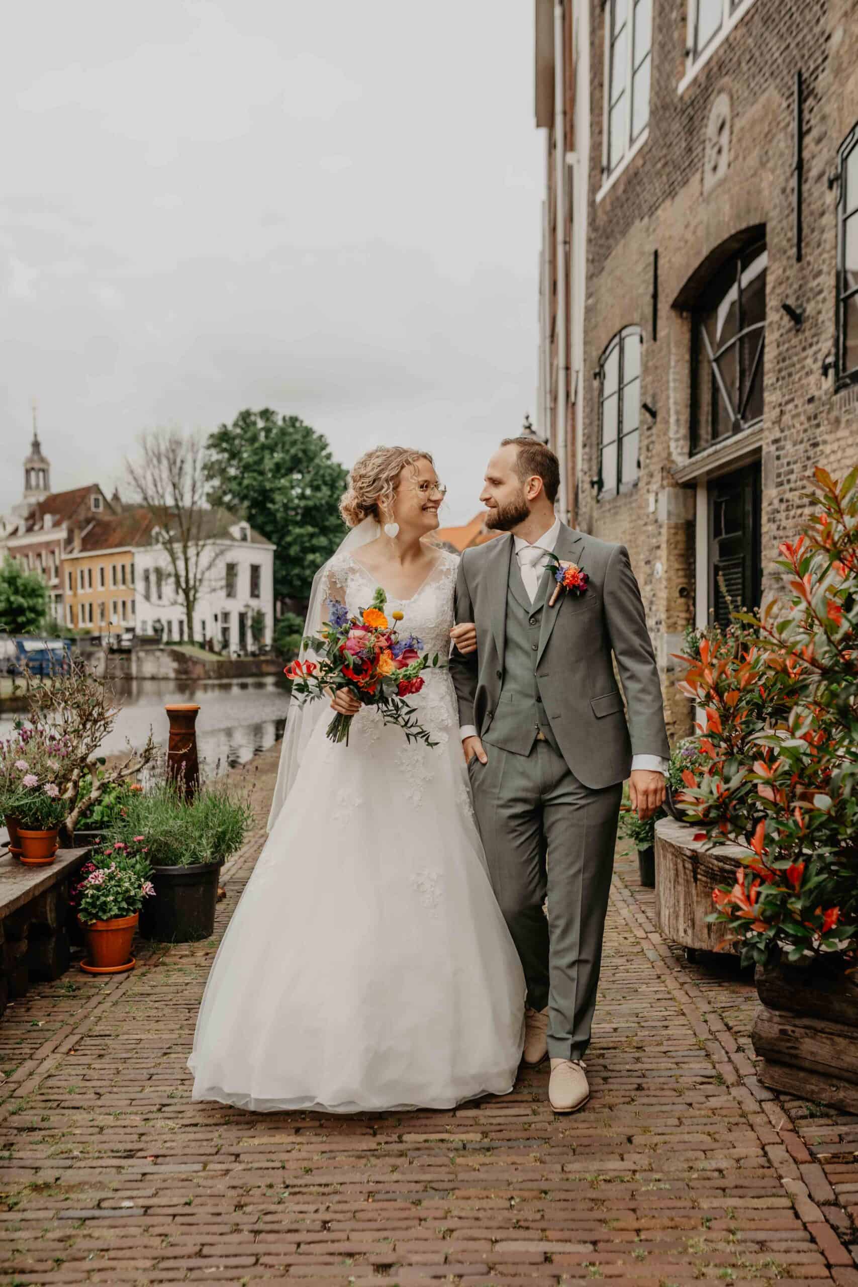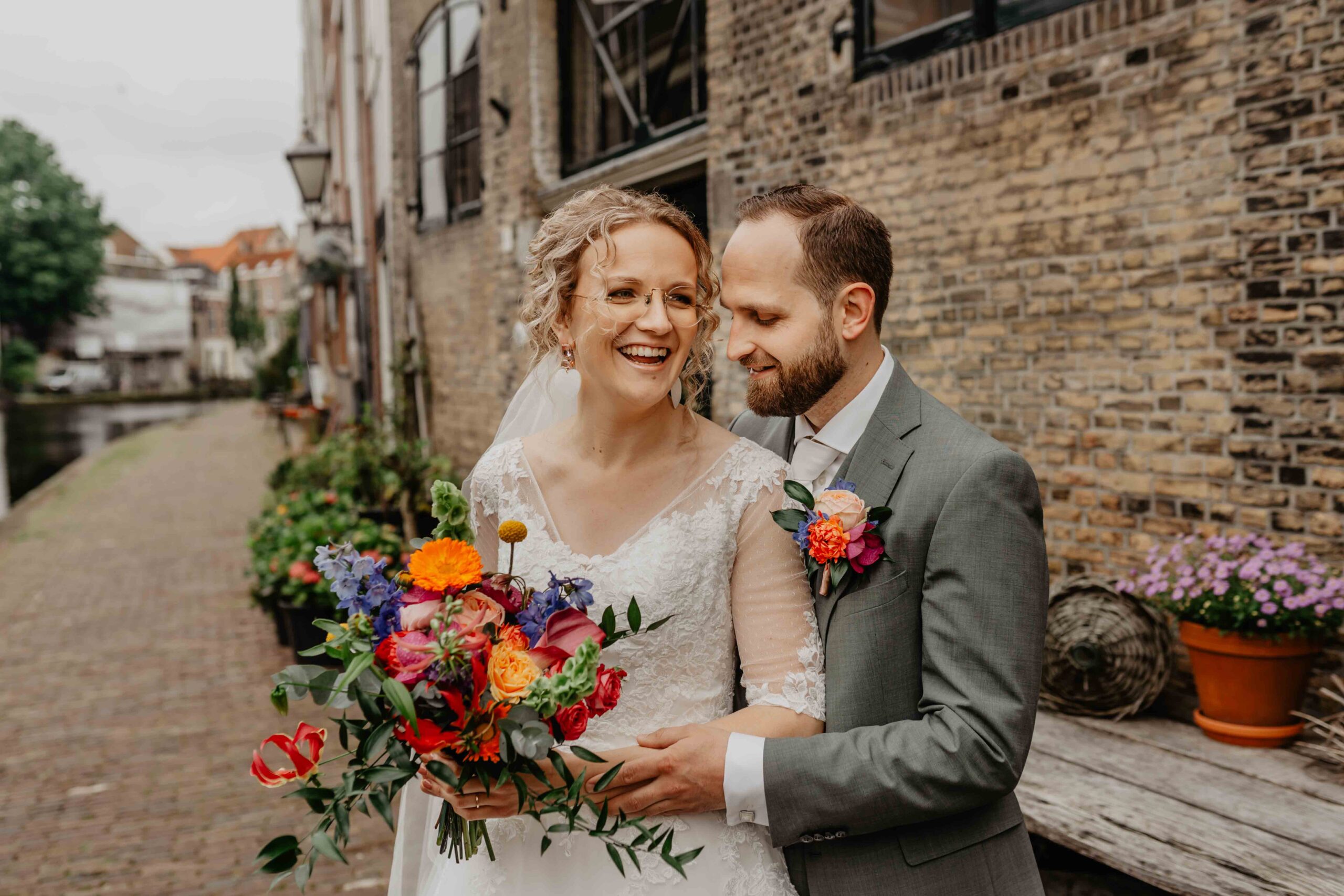 De fotoshootlocatie was het oude centrum van Schiedam. We zochten kleurrijke plekjes met bloemen op, helemaal passend bij het geweldige bruidsboeket van Reinelieke. De oude straatjes, muurtjes en gebouwen vormden een mooi geheel met het bruidspaar.