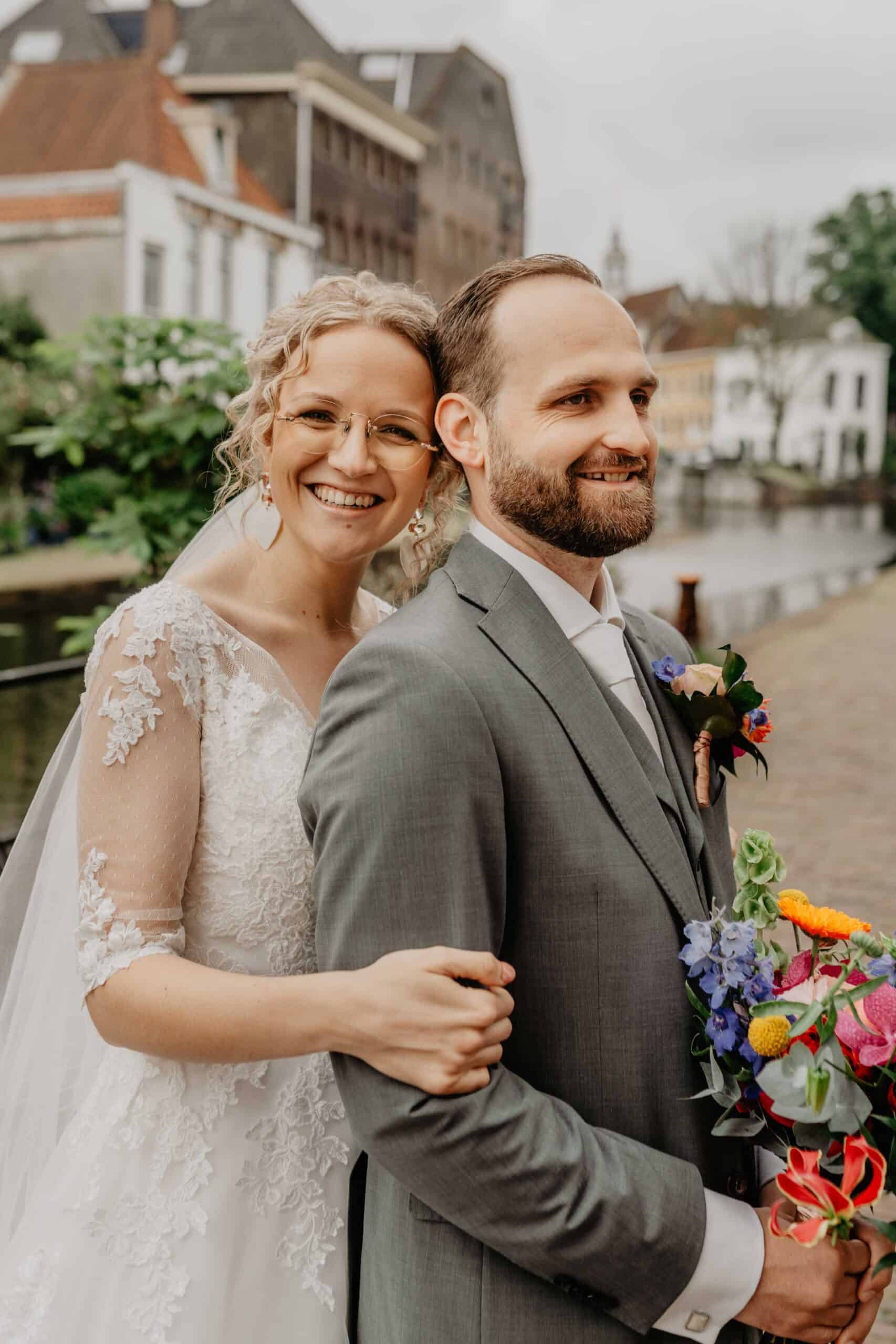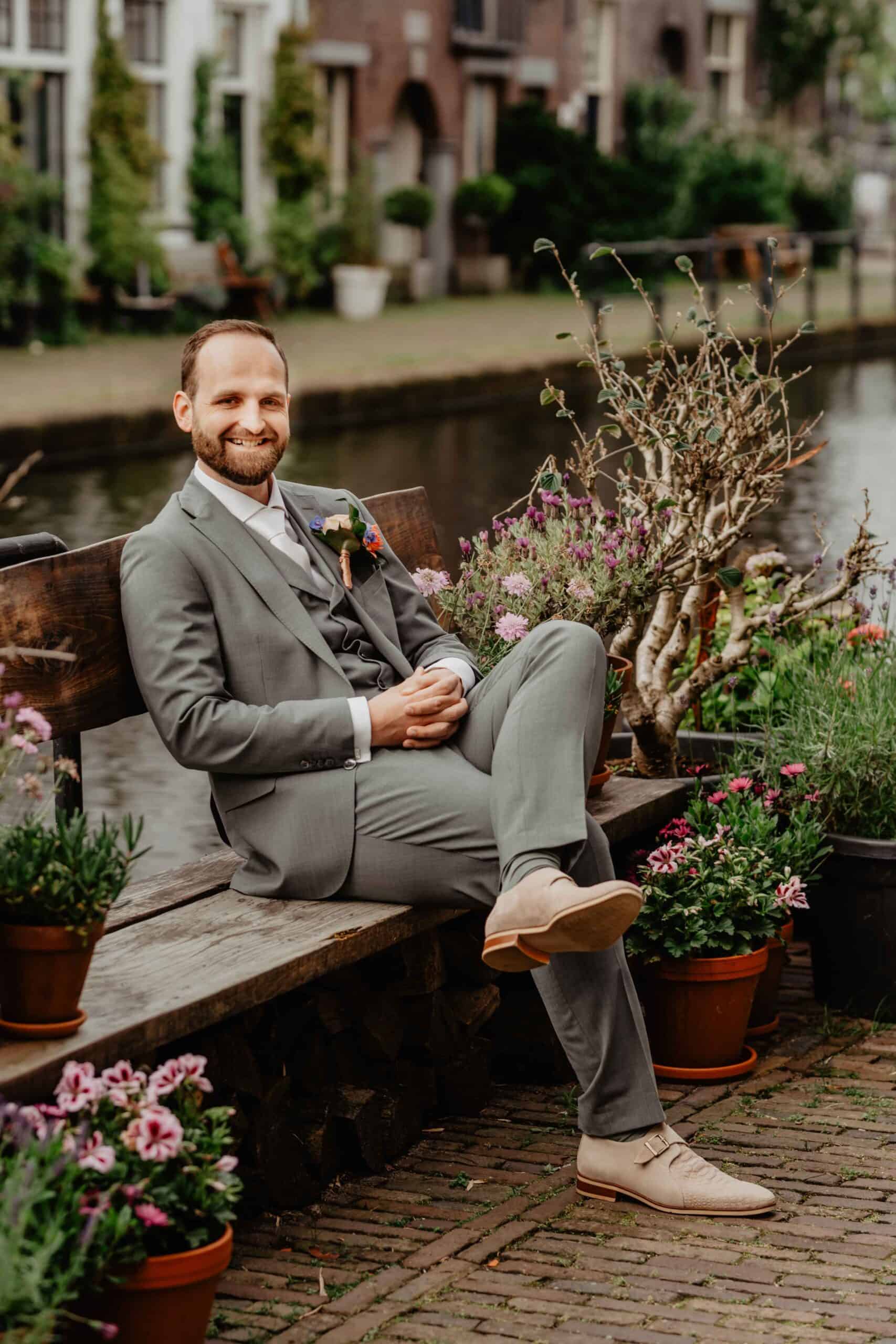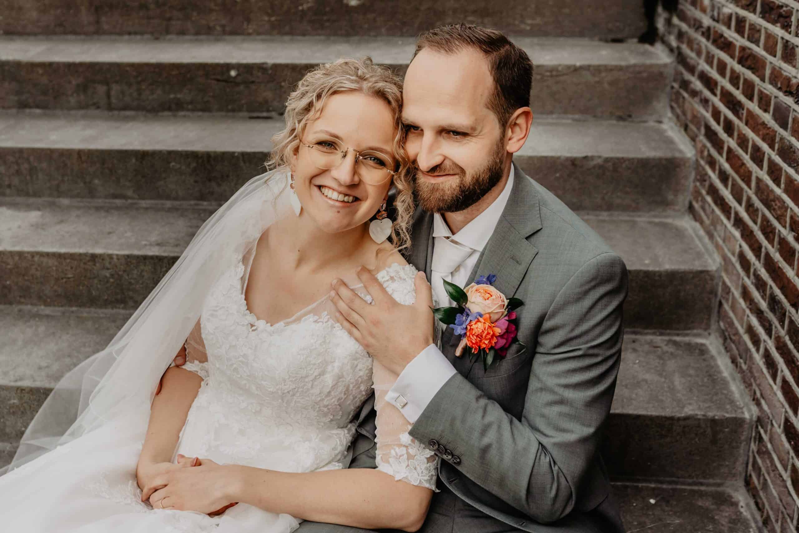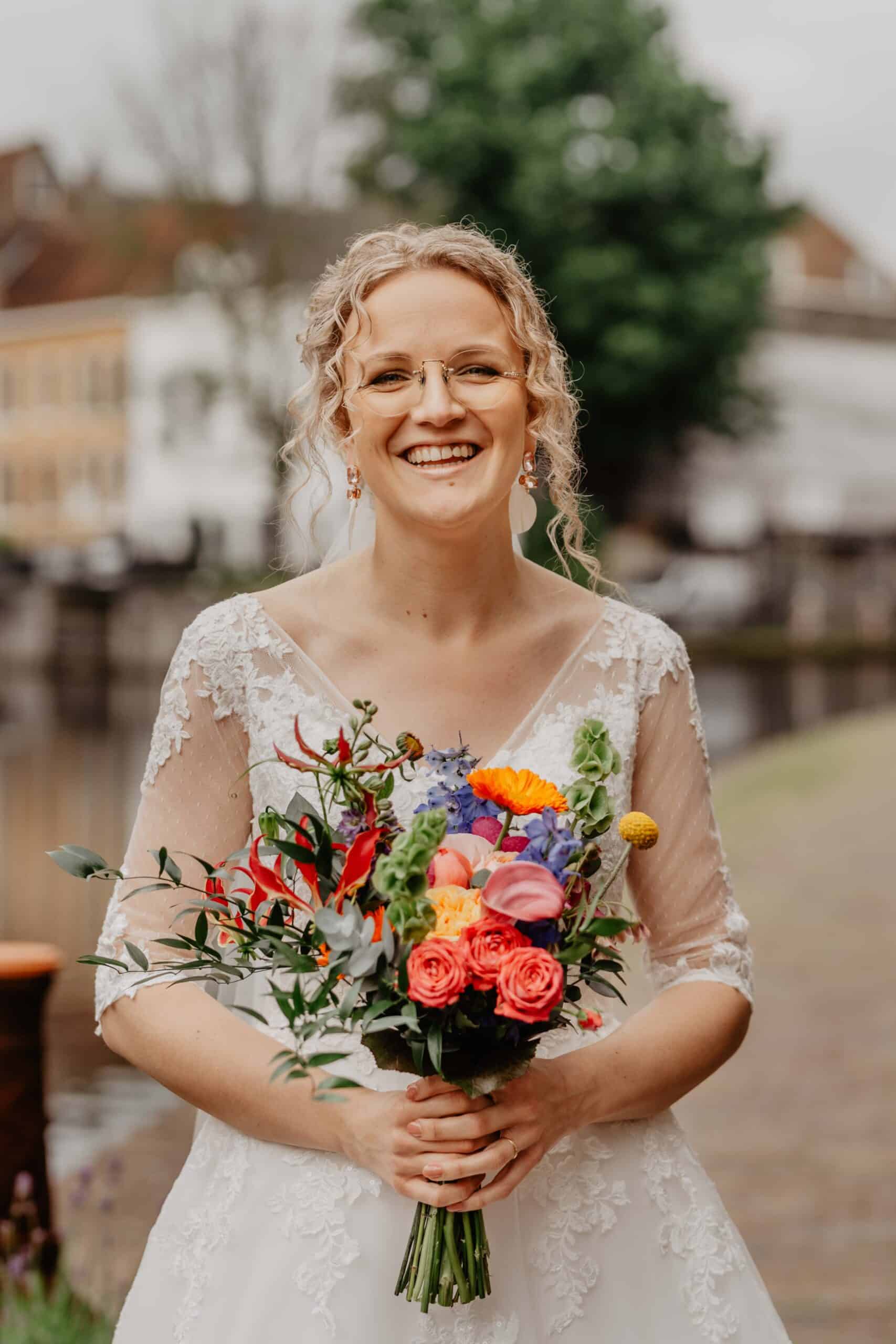 De fotoshootlocatie was het oude centrum van Schiedam. We zochten kleurrijke plekjes met bloemen op, helemaal passend bij het geweldige bruidsboeket van Reinelieke. De oude straatjes, muurtjes en gebouwen vormden een mooi geheel met het bruidspaar.