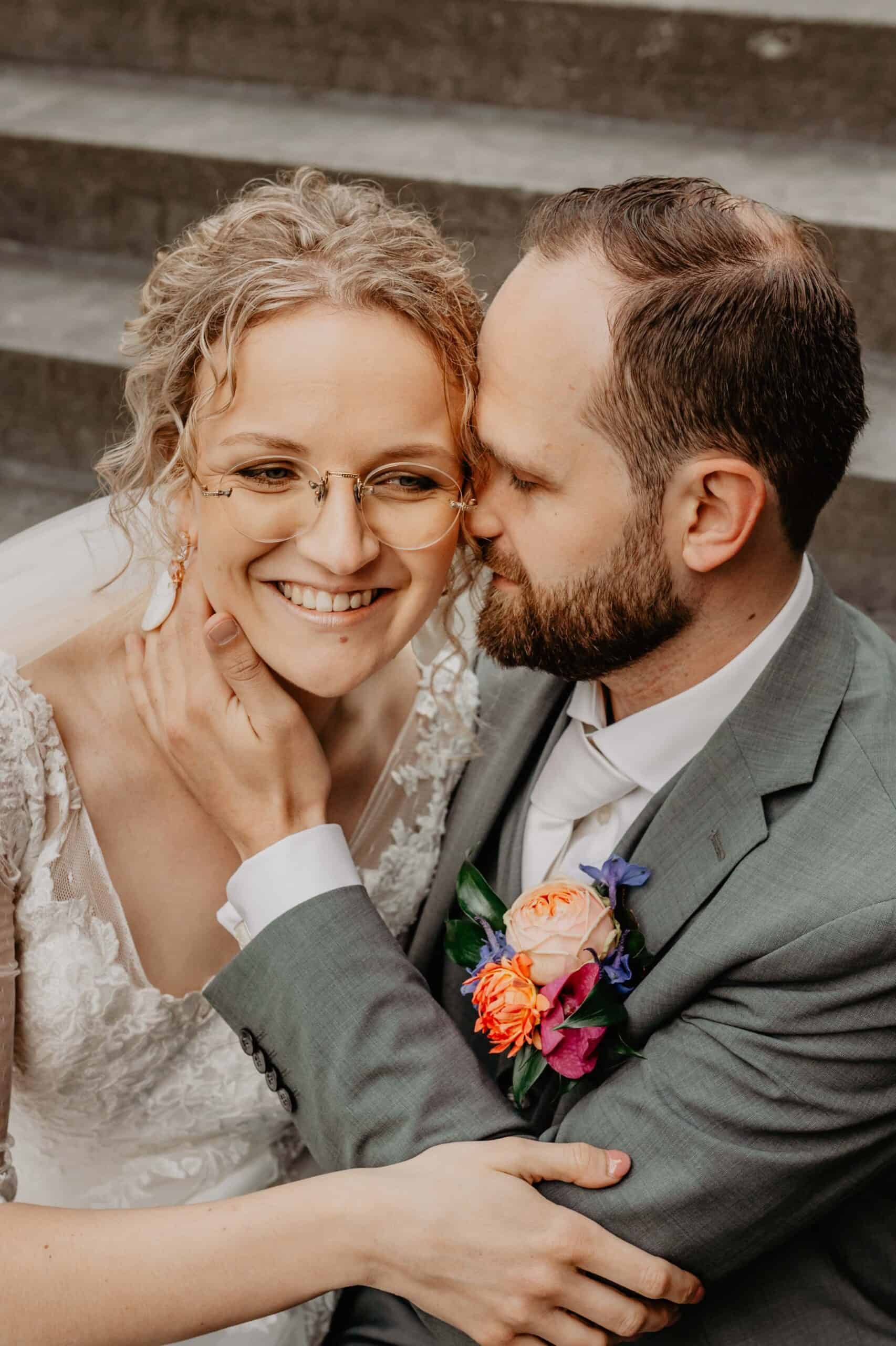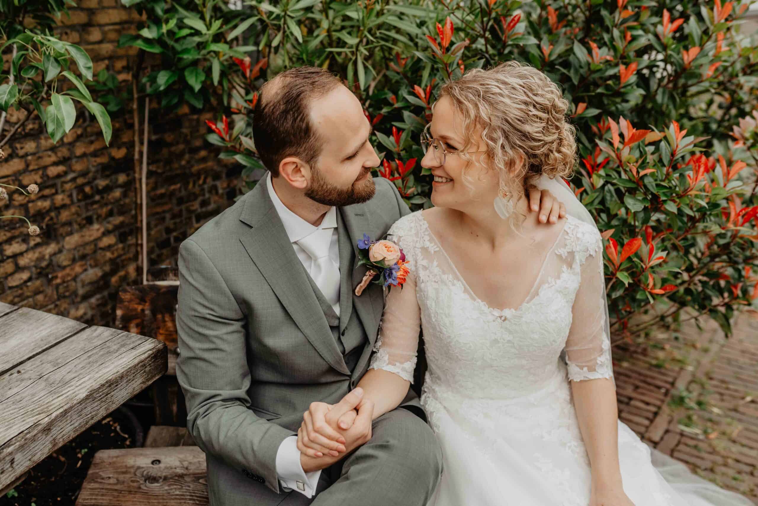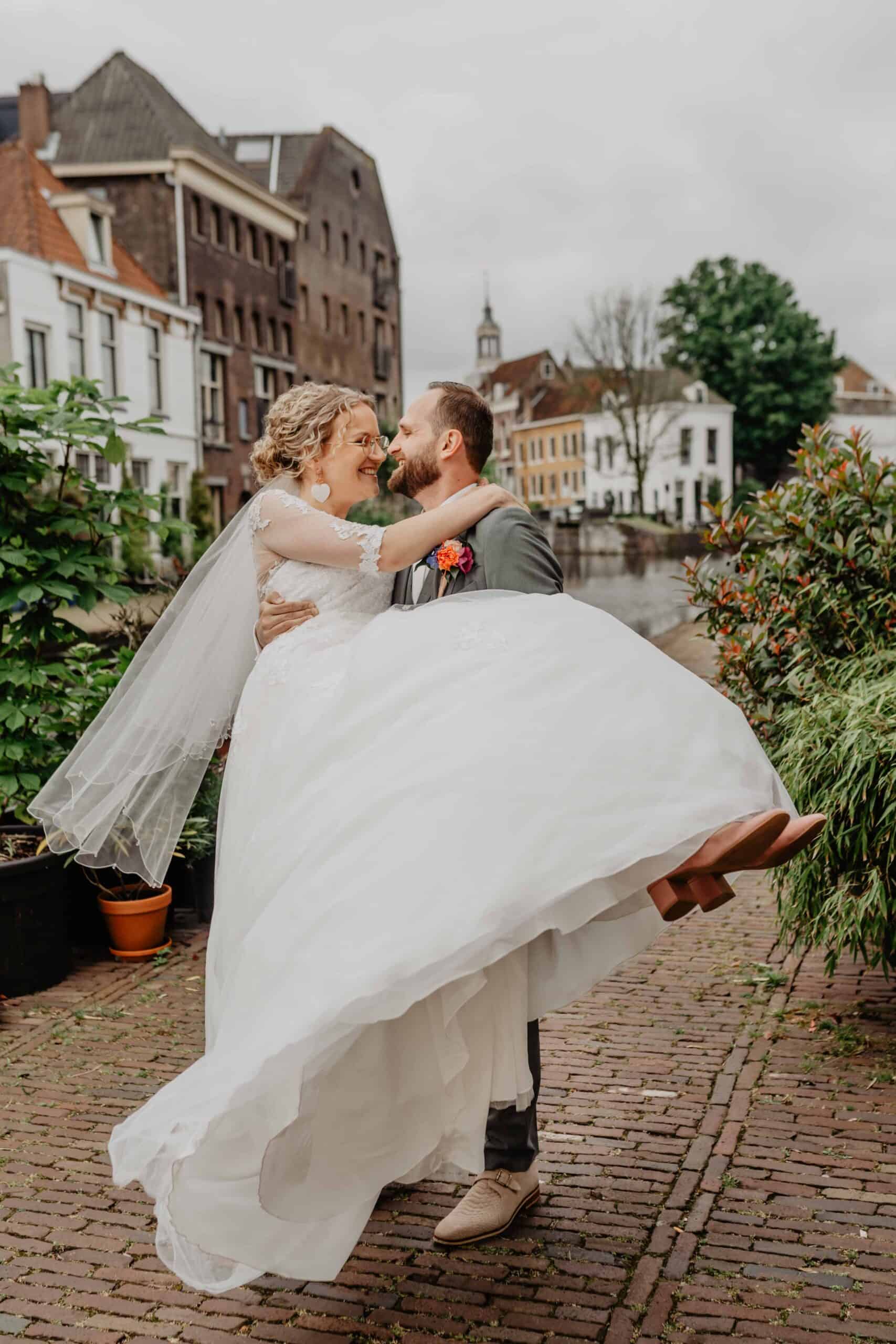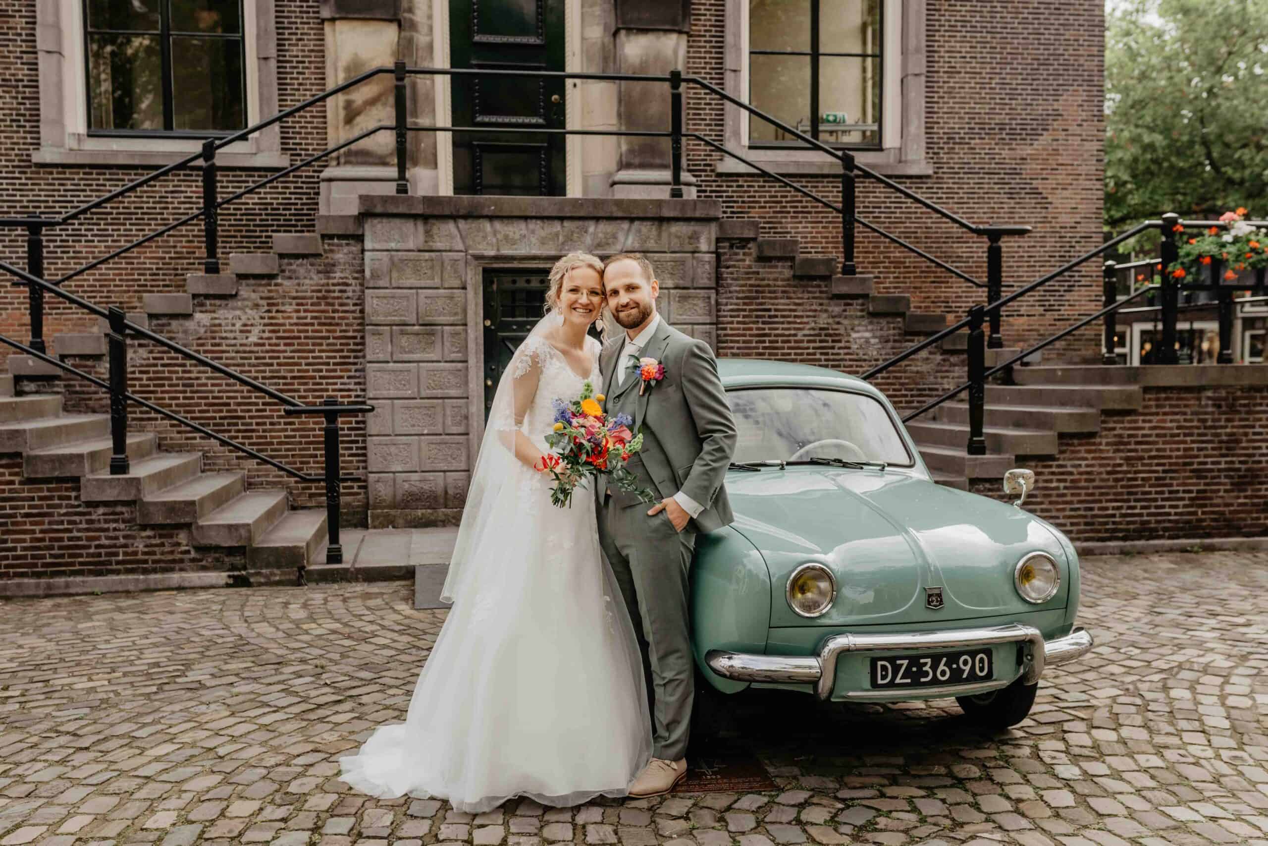 De fotoshootlocatie was het oude centrum van Schiedam. We zochten kleurrijke plekjes met bloemen op, helemaal passend bij het geweldige bruidsboeket van Reinelieke. De oude straatjes, muurtjes en gebouwen vormden een mooi geheel met het bruidspaar.