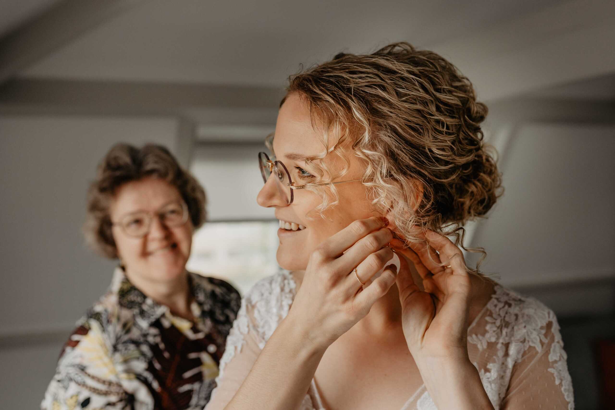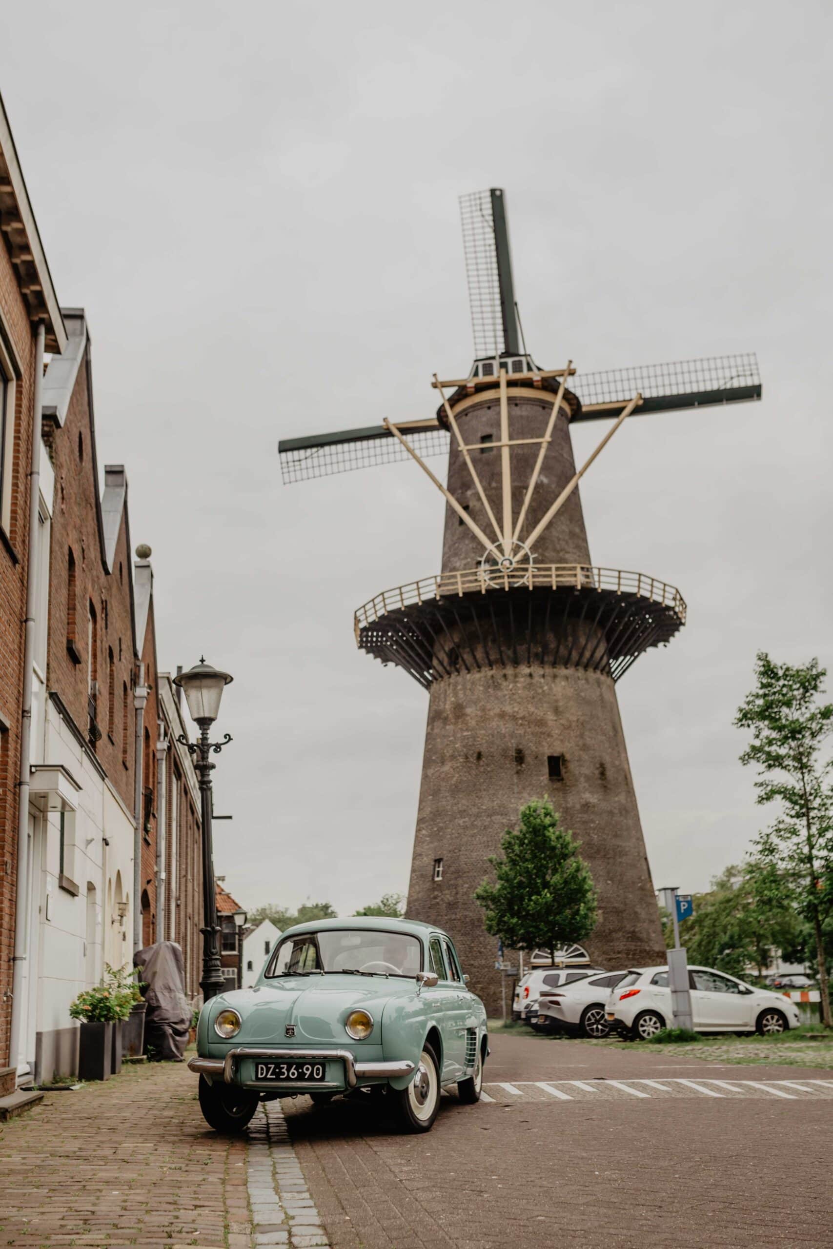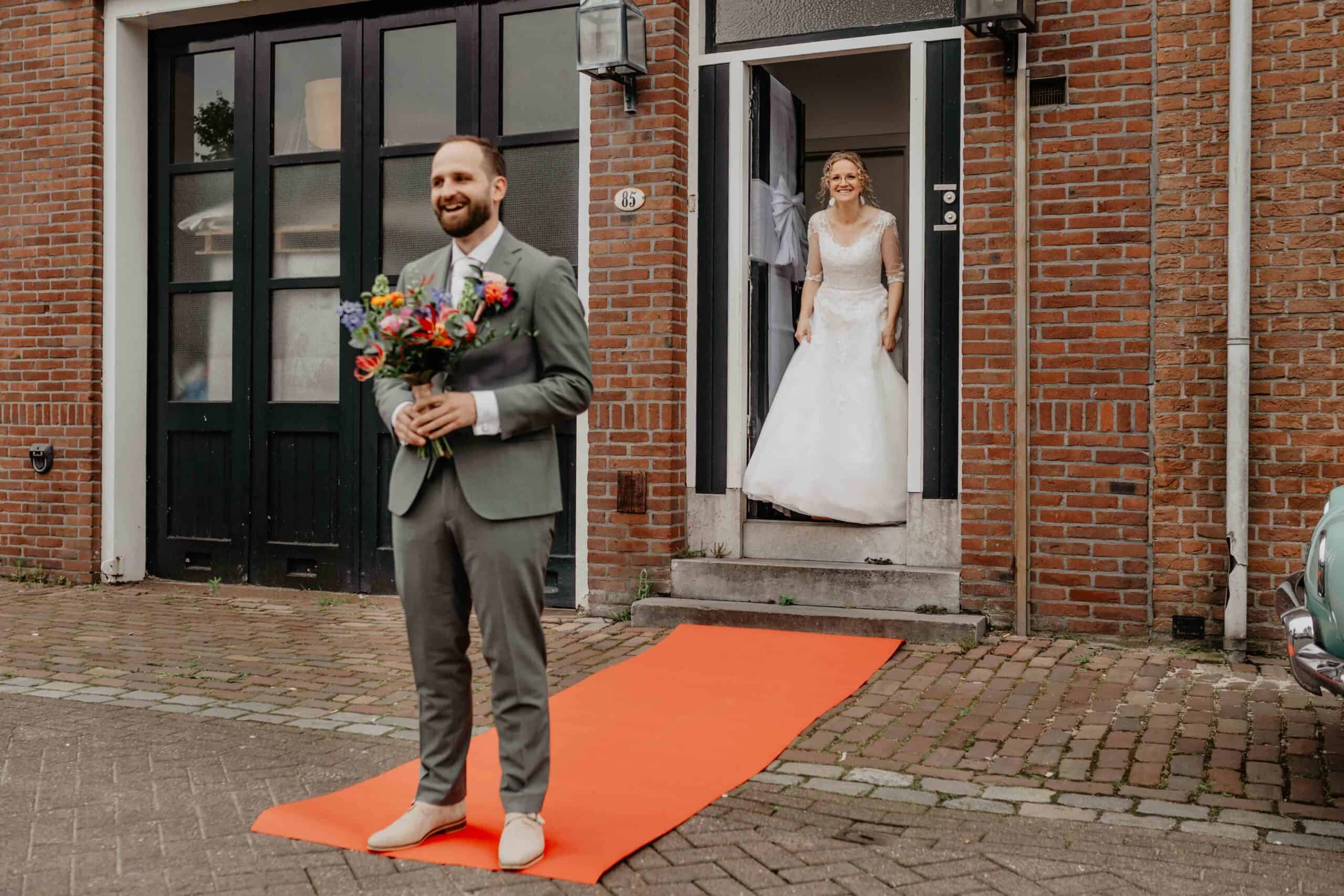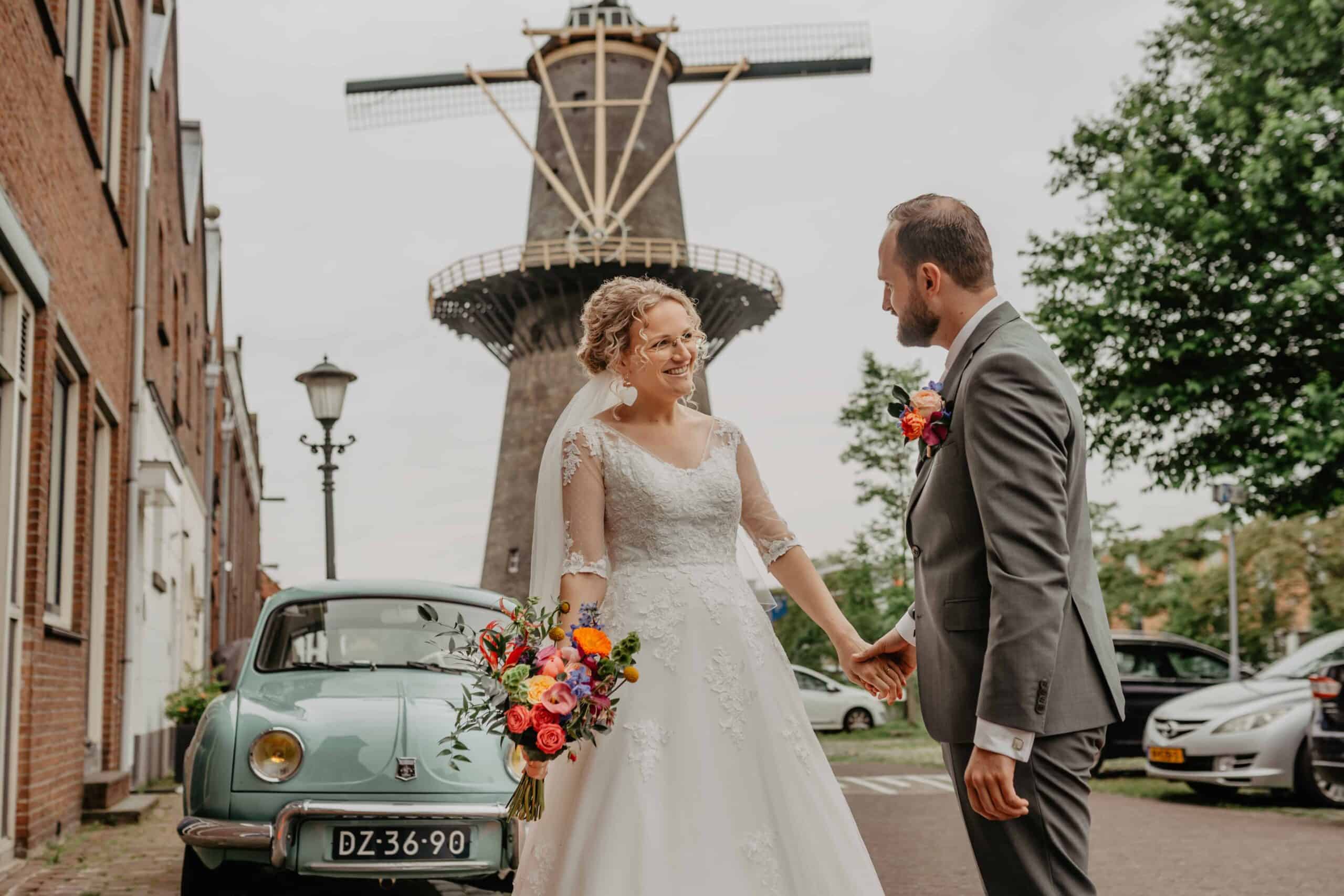 De dag van Wouter & Reinelieke begon in Schiedam. In het schattige kleurrijke huisje, waar Wouter & Reinelieke gaan wonen. Reinelieke kreeg een mooi bruidskapsel, onder toeziend oog van vader en moeder. Het aantrekken van de jurk ging lekker vlot, waardoor we nog mooi tijd over hadden voor het aandoen van de schoenen en sieraden én de first look met vader. Ondertussen reed Wouter vanuit Oud-Beijerland naar Schiedam voor de first look. Deze vond traditioneel plaats bij de voordeur, met de prachtige molens van Schiedam als achtergronddecor.
