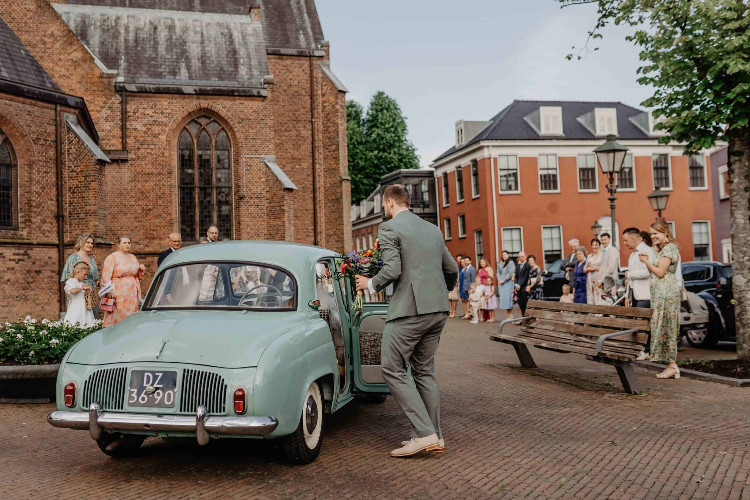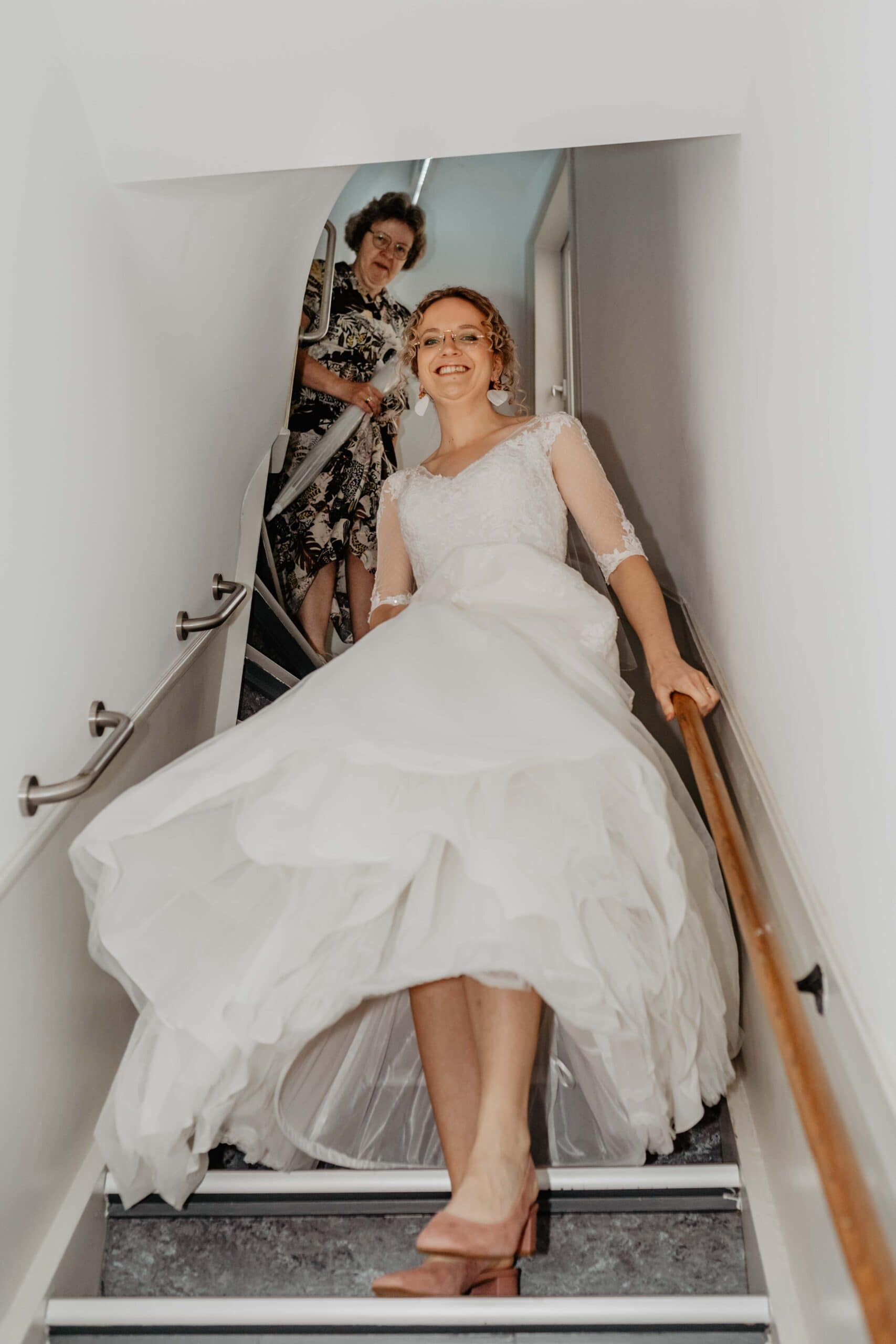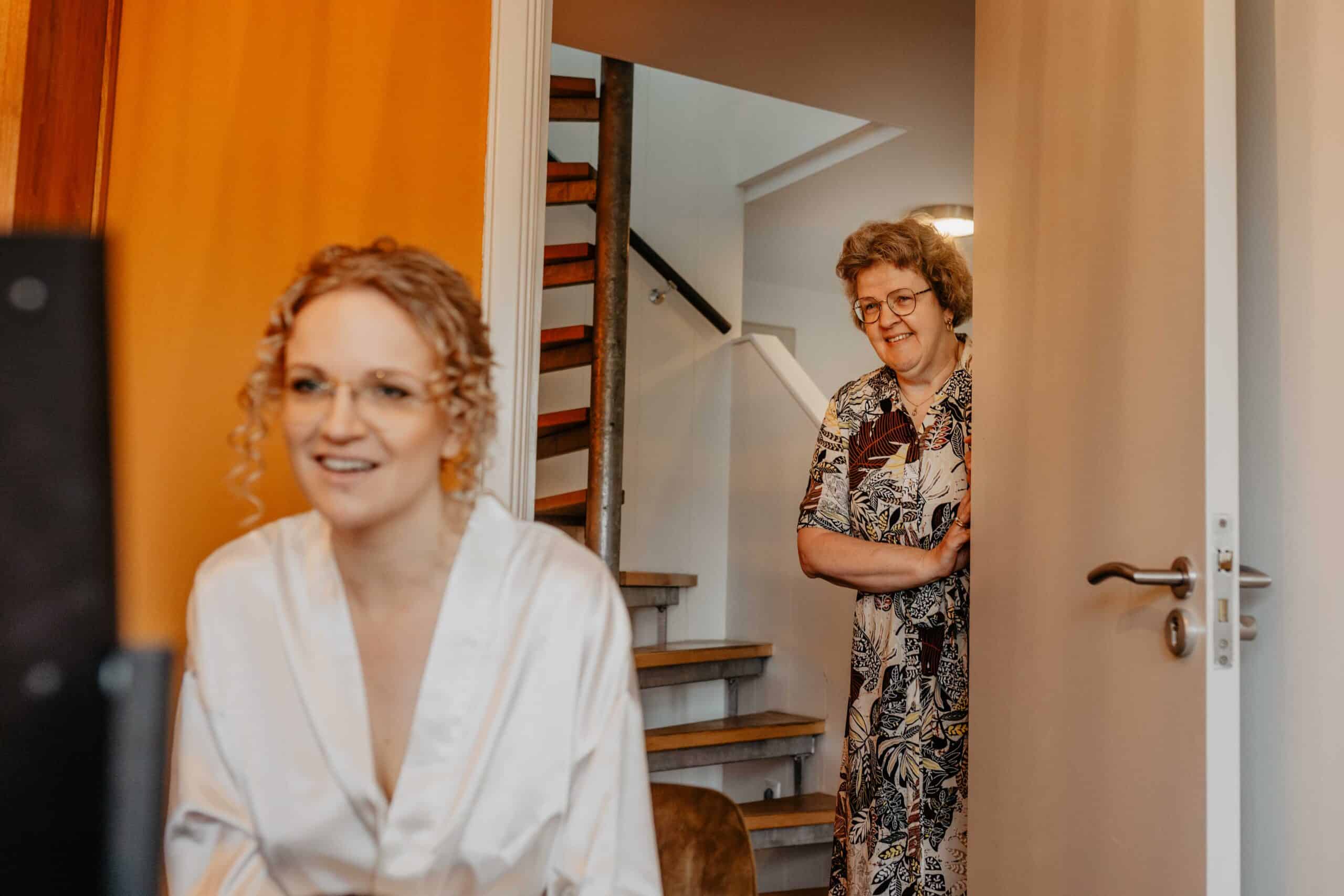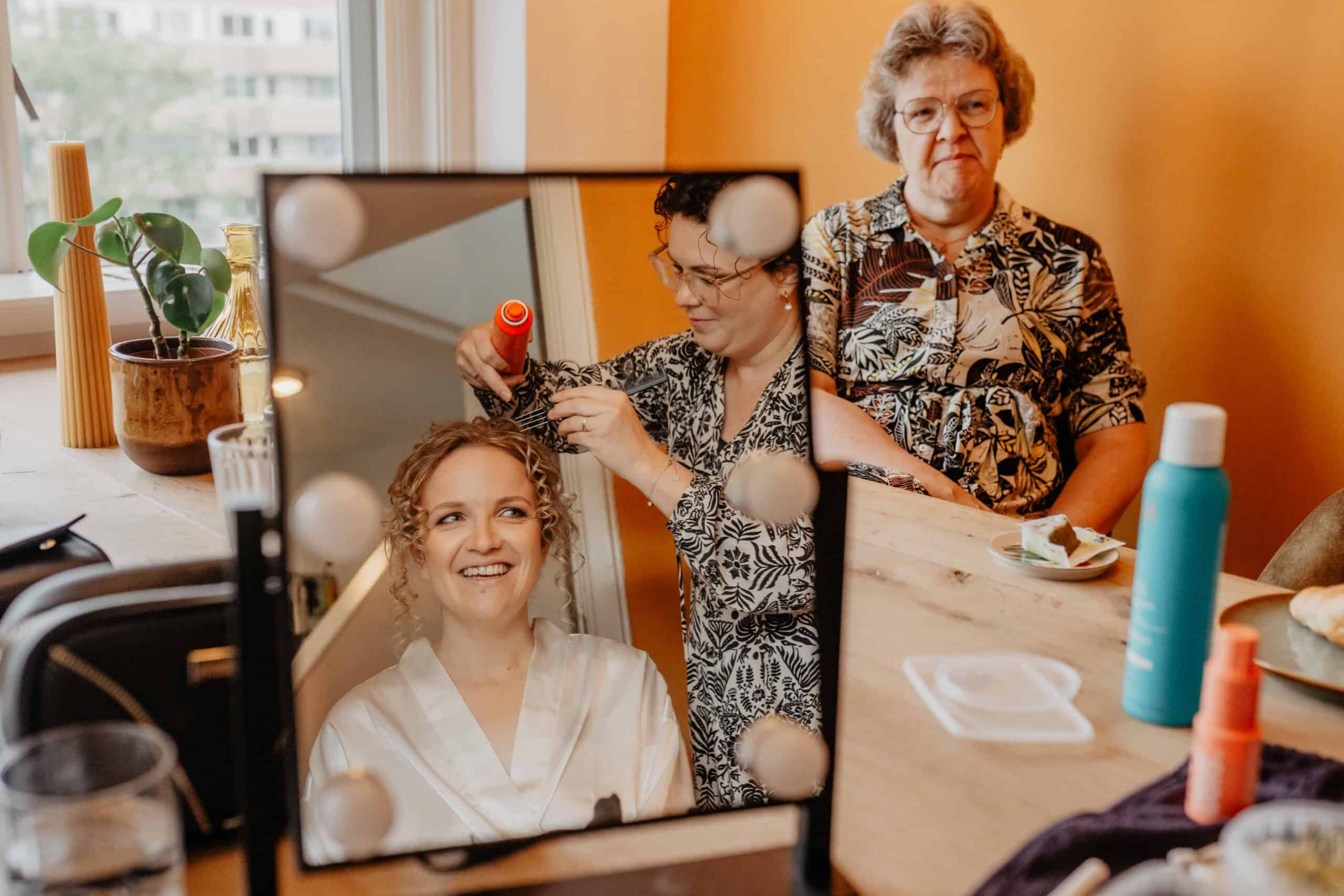 De dag van Wouter & Reinelieke begon in Schiedam. In het schattige kleurrijke huisje, waar Wouter & Reinelieke gaan wonen. Reinelieke kreeg een mooi bruidskapsel, onder toeziend oog van vader en moeder. Het aantrekken van de jurk ging lekker vlot, waardoor we nog mooi tijd over hadden voor het aandoen van de schoenen en sieraden én de first look met vader. Ondertussen reed Wouter vanuit Oud-Beijerland naar Schiedam voor de first look. Deze vond traditioneel plaats bij de voordeur, met de prachtige molens van Schiedam als achtergronddecor.