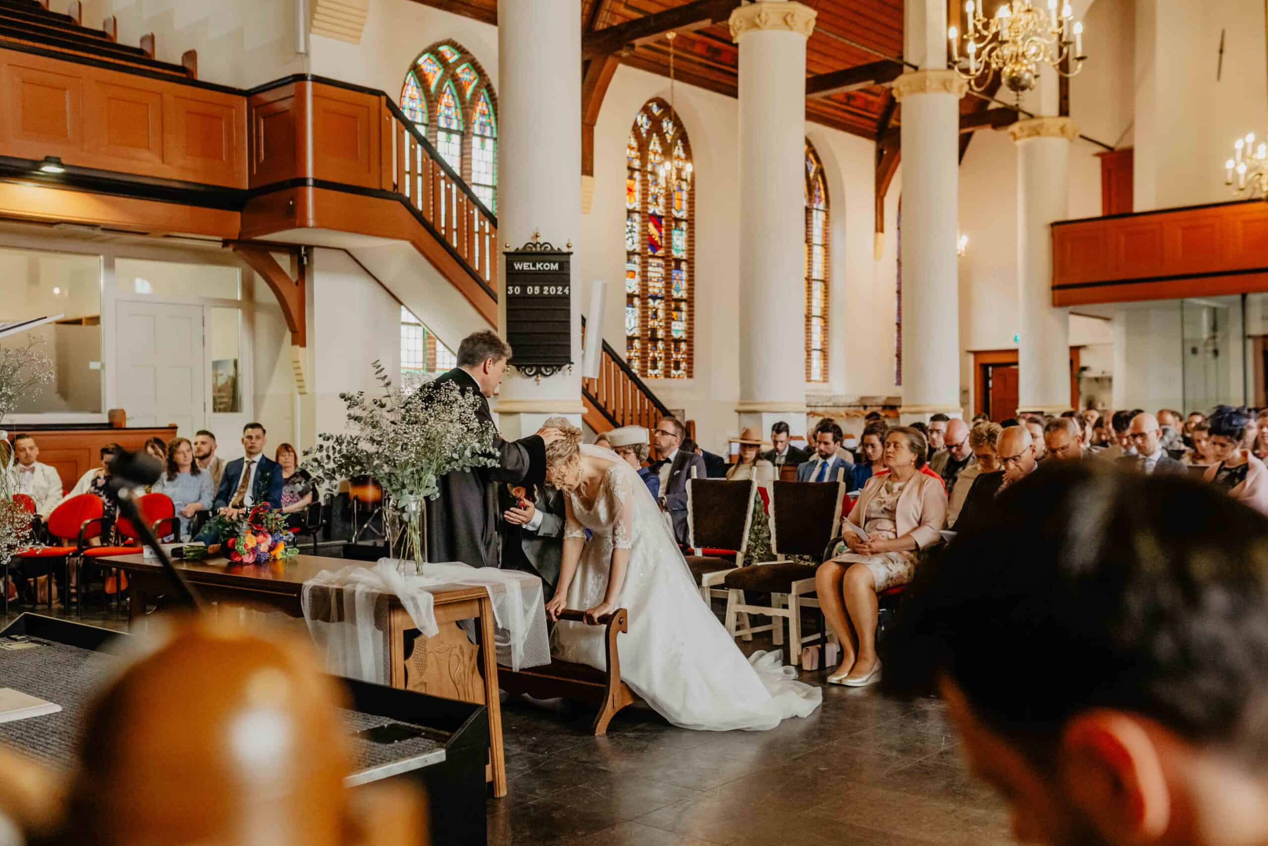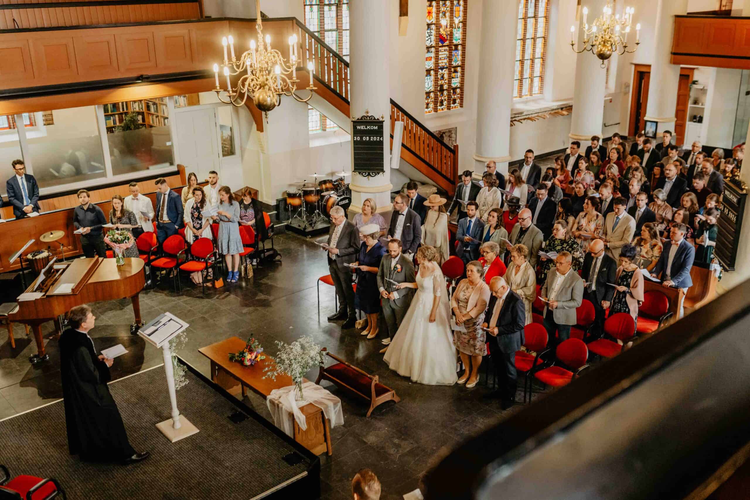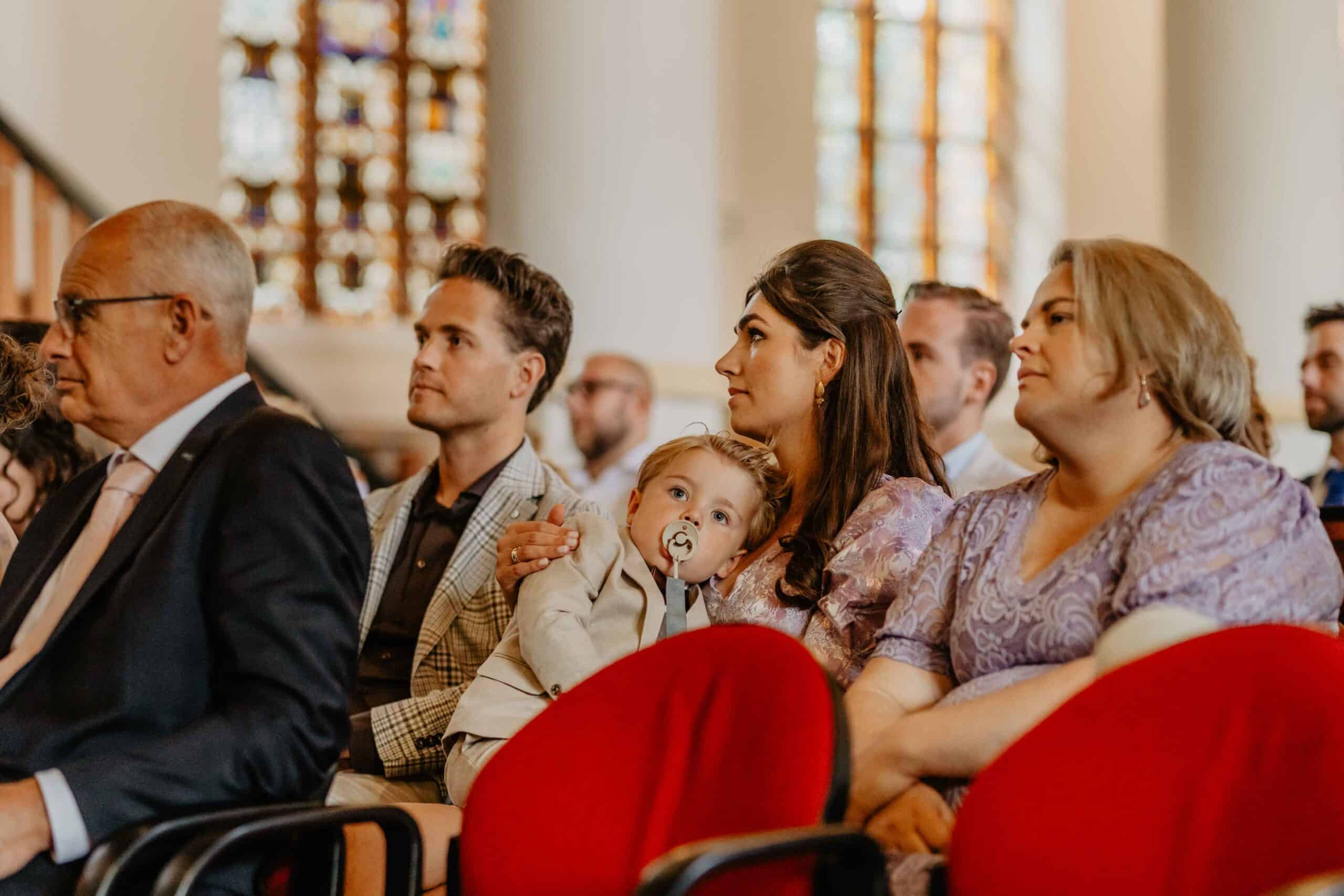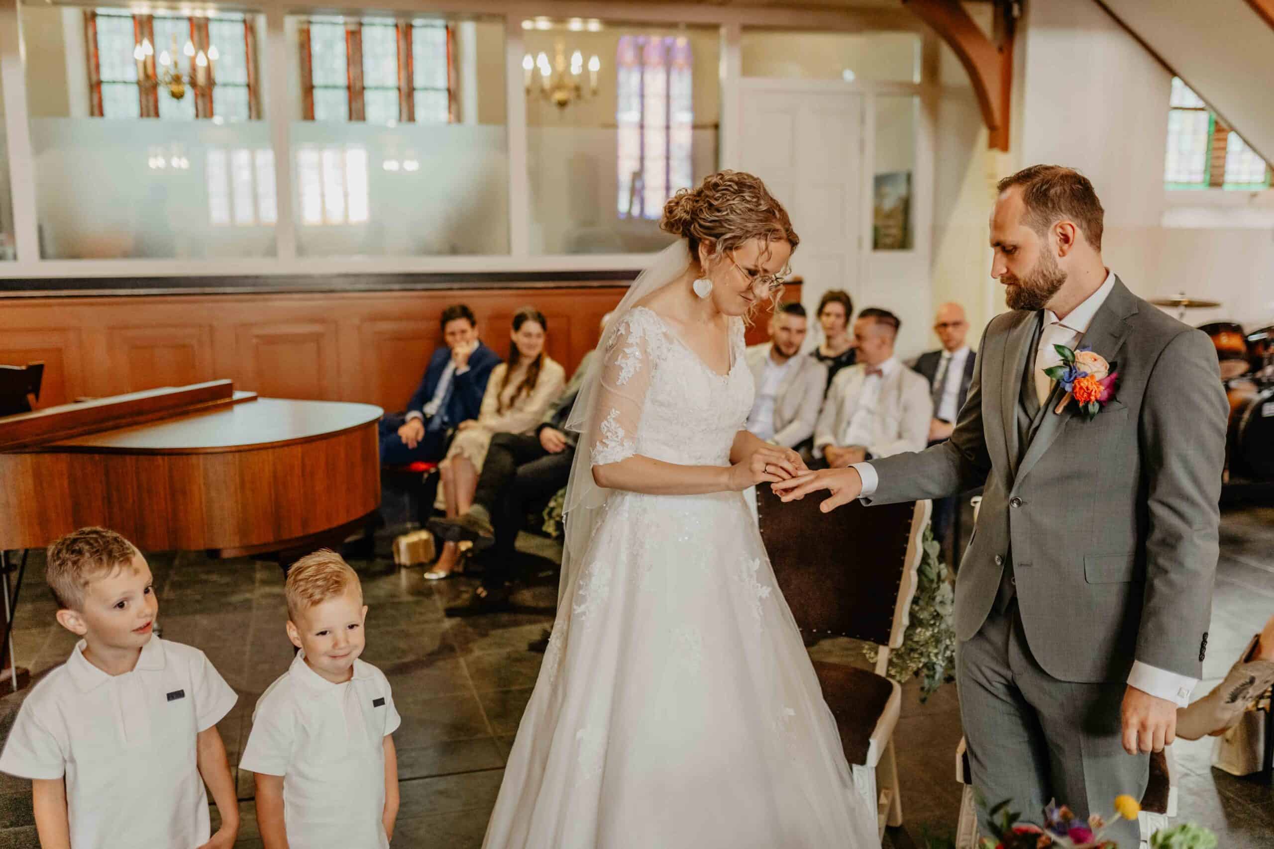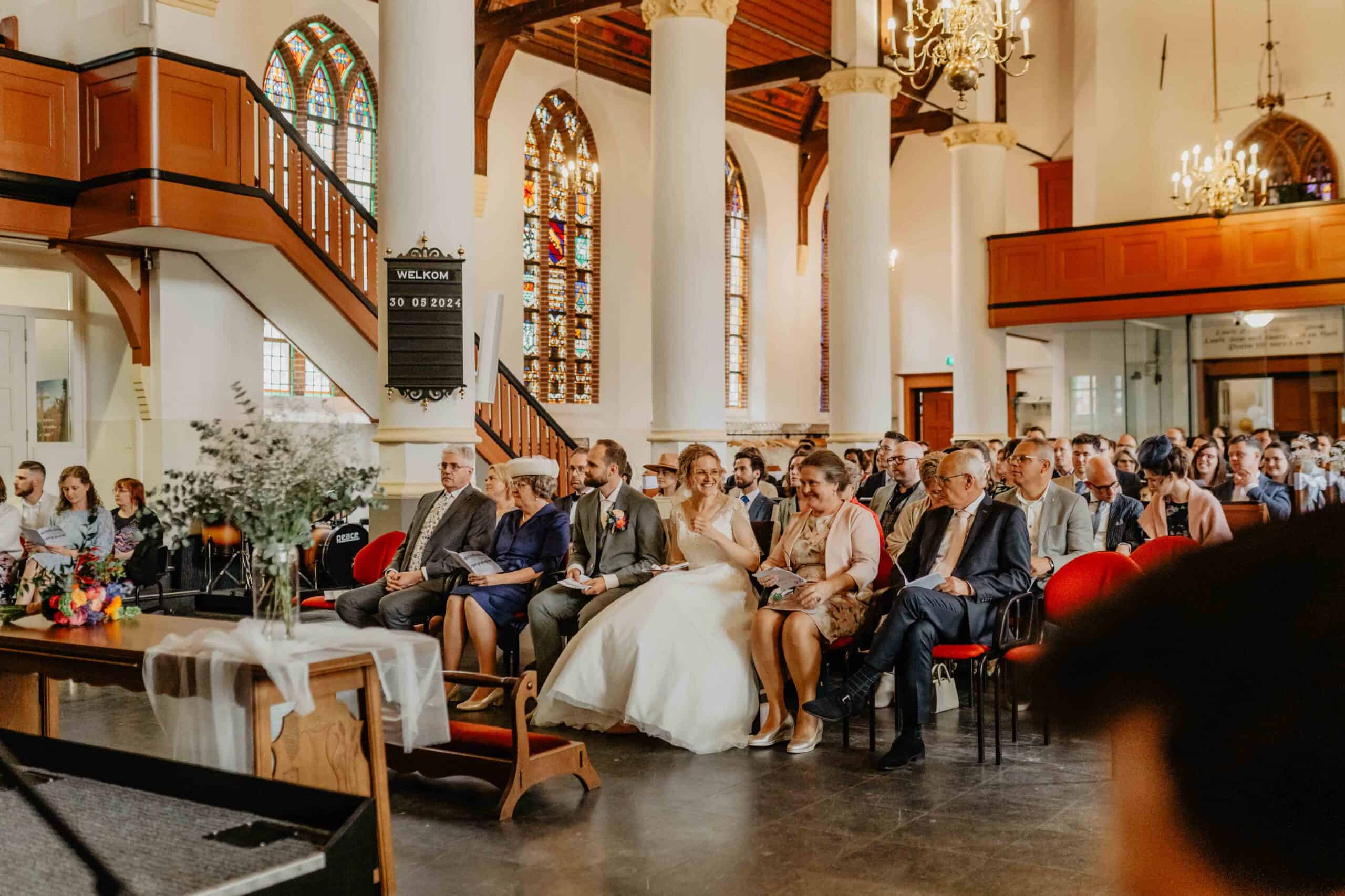 Het ontvangst door de daggasten was vrolijk en gezellig. Met name oma was helemaal ontroerd toen ze bruid Reinelieke in haar trouwjurk zag. Na een kort welkom was het tijd voor de ceremonie. Deze vond ook plaats in de Adriaen Janszkerk, zo sfeervol! Er werd hard gelachen tijdens de speech van de trouwambtenaar en Wouter & Reinelieke waren erg ontspannen. En de kindjes gingen tijdens de ceremonie lekker hun eigen gang 🙂