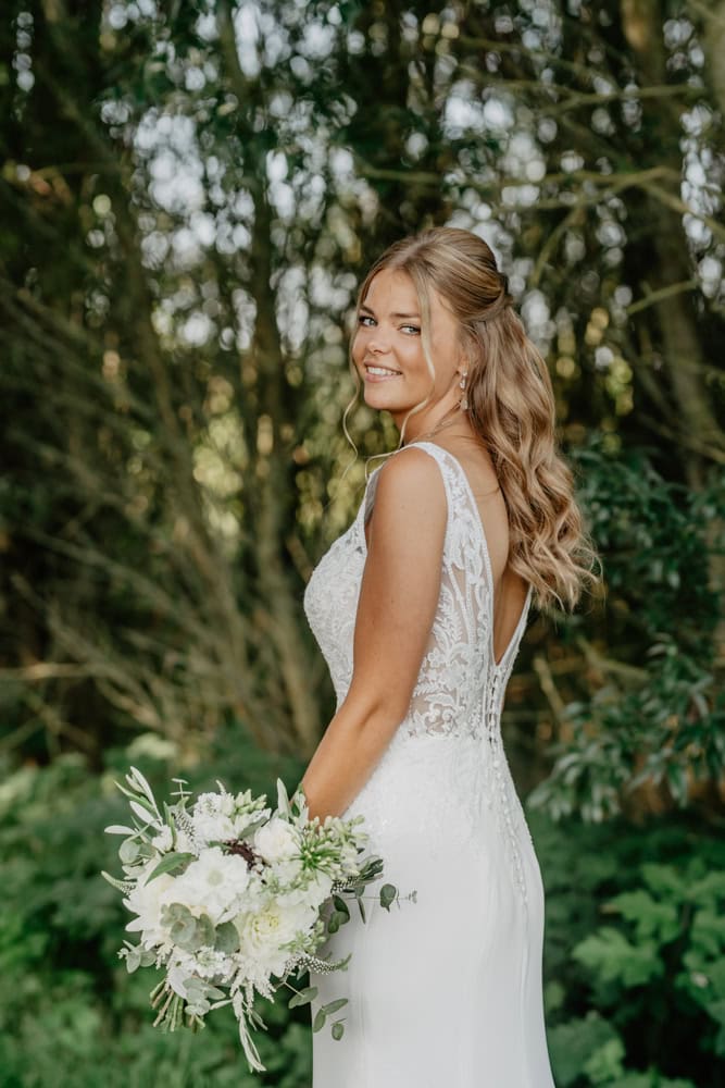Toen we bij Melissa thuis aankwamen, konden we mooi nog wat beelden maken van haar make-up en bruidskapsel. Haar ouders, maar ook haar broers waren bij dit moment aanwezig. Het aankleden deden we in de achtertuin; een mooie groene achtergrond voor dit tafereel!